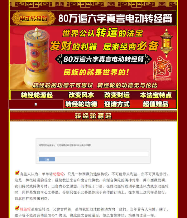 转经轮网站的名字取自产品的名称,这是一个很特殊的网站,整个网站只有一个页面,内容也特别简洁,简洁明了,主要为了方便顾客订购转经纶。